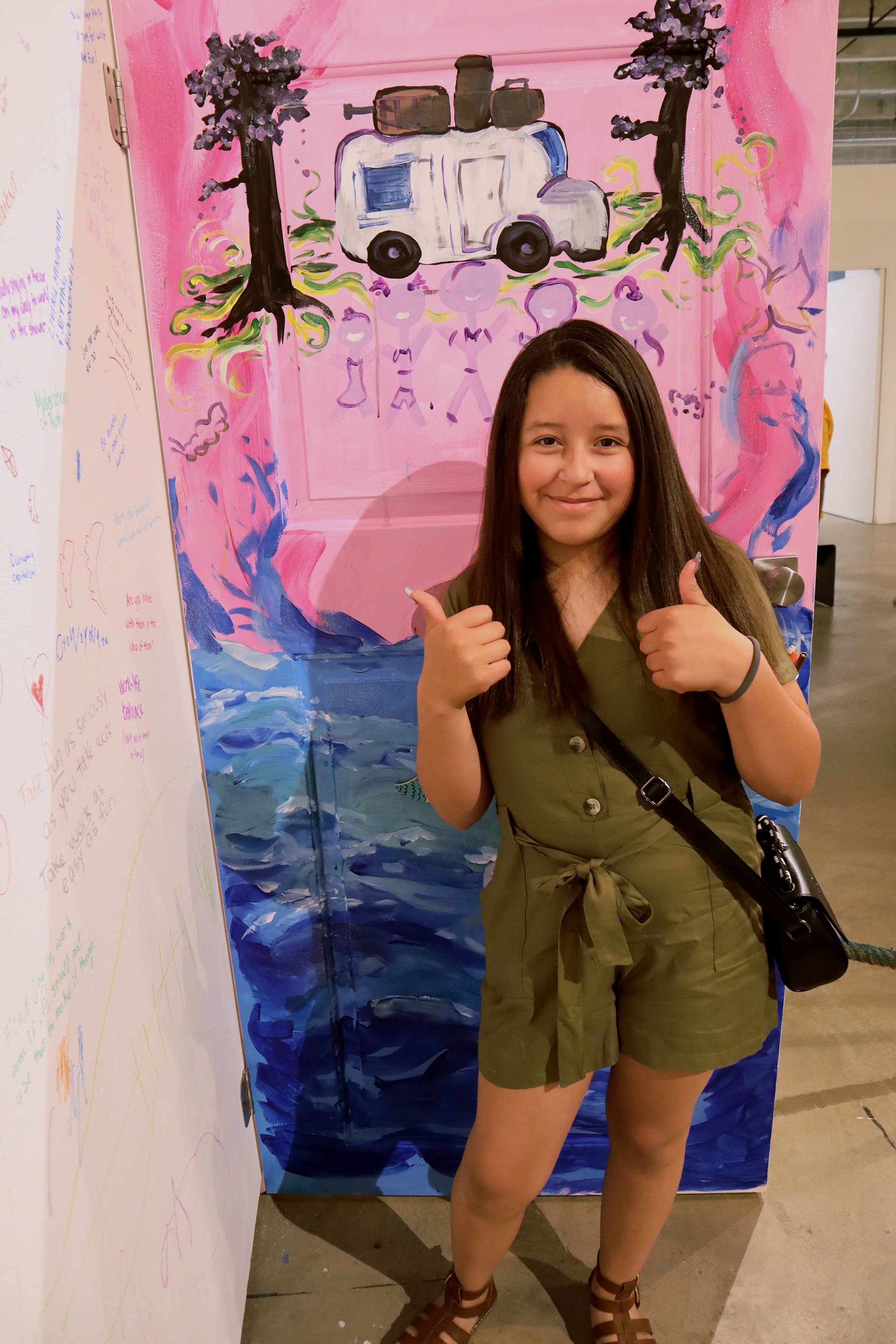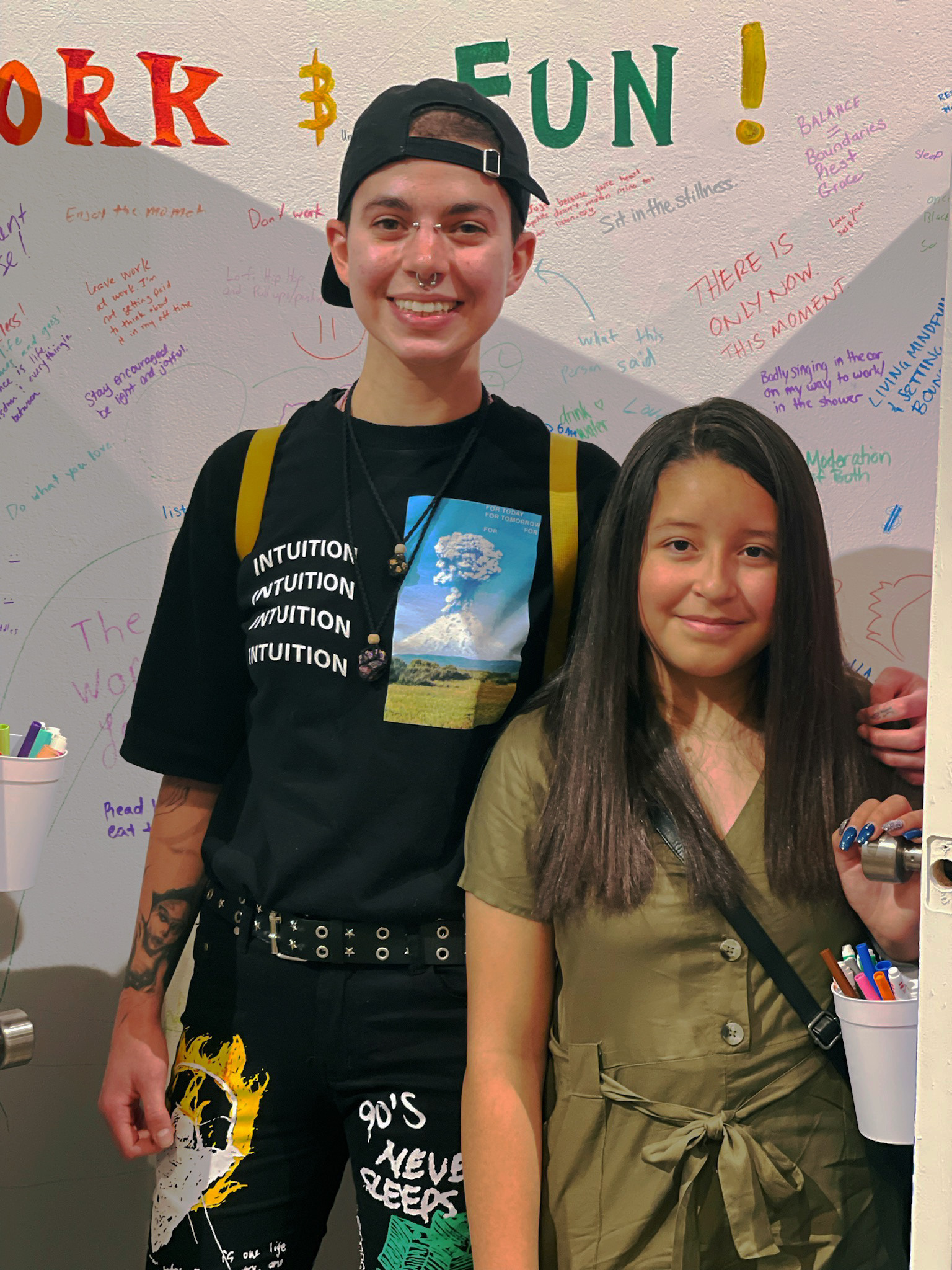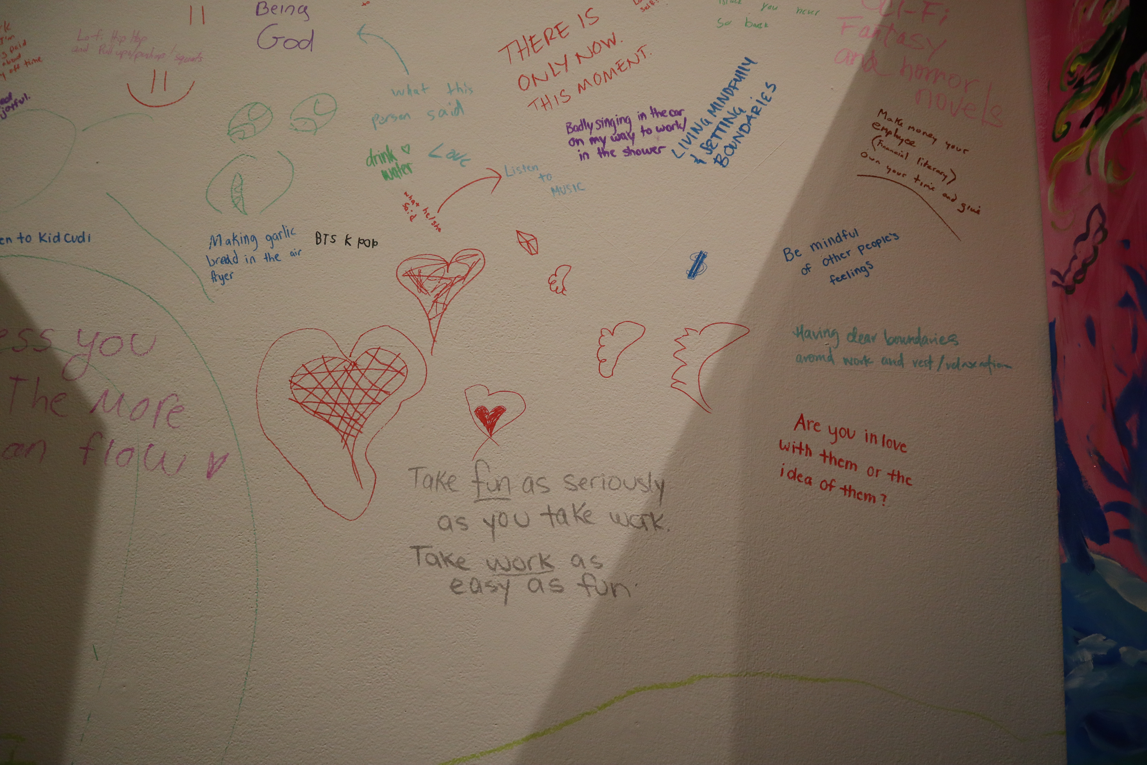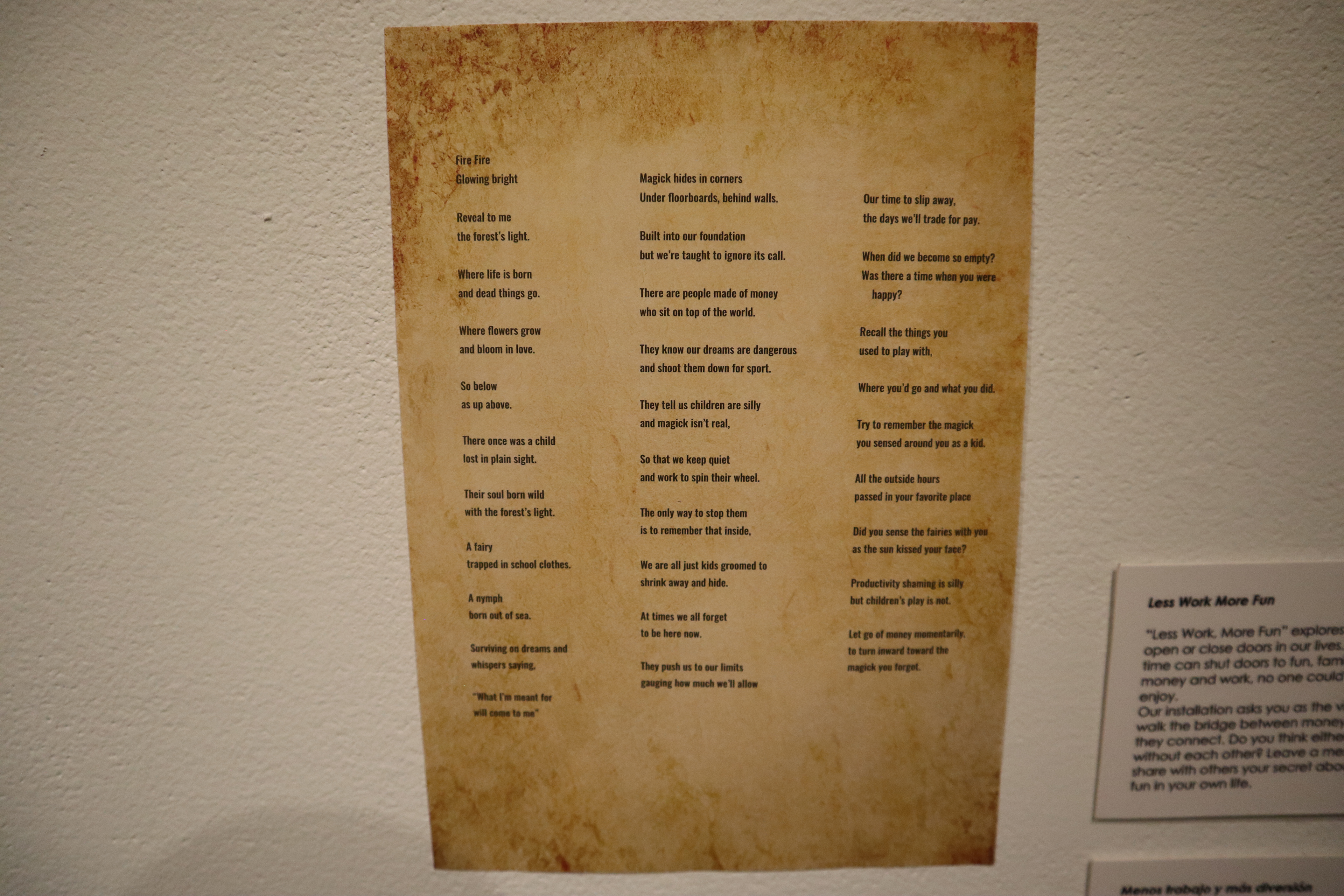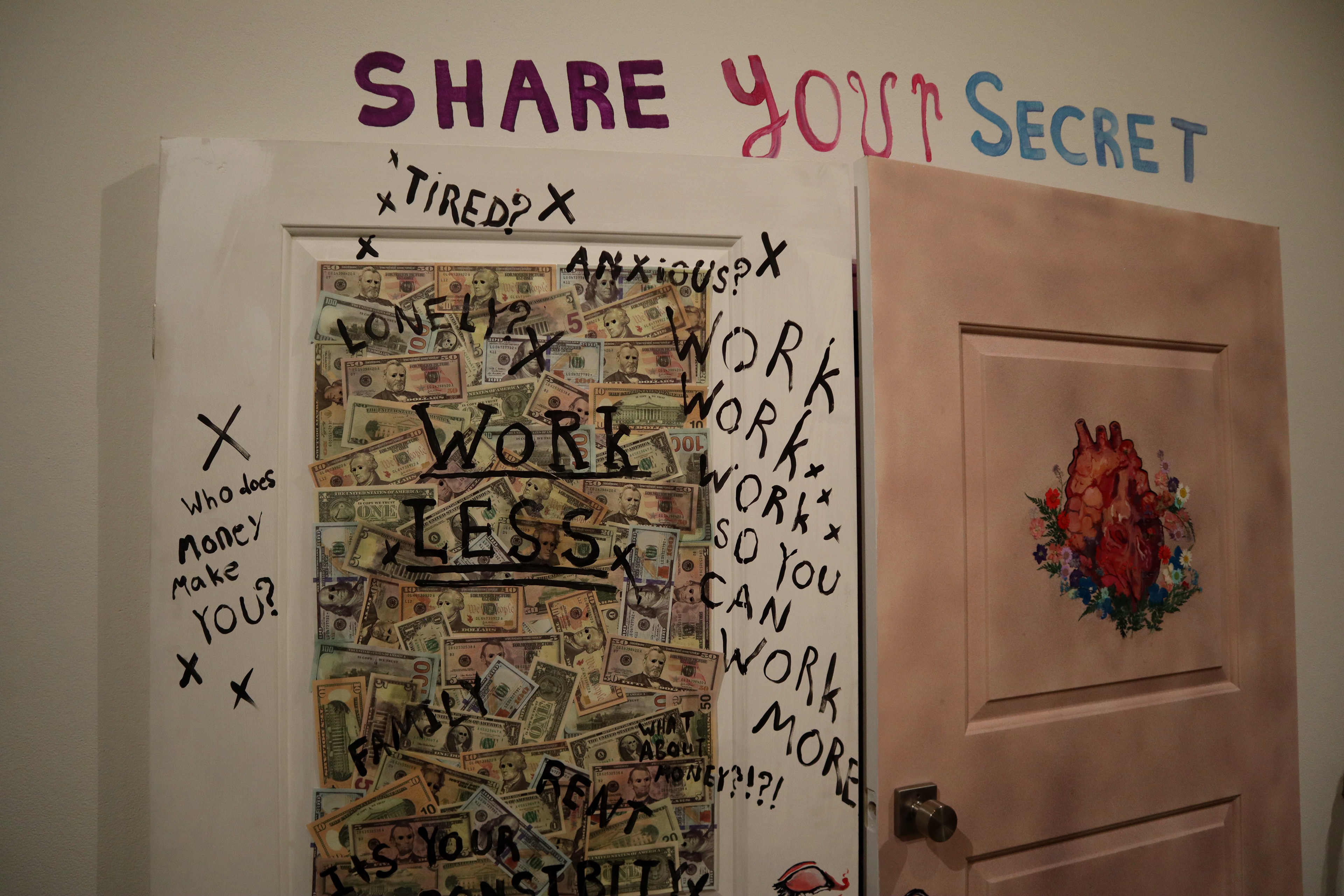 Less Work, More Fun is a product of Redline Contemporary Art Center’s art mentoring program. This installation is a collaboration between Aldinger, the mentoring artist, and Quetzalli Casillas, his mentee. It explores how money can trap people in situations, and open or close doors to opportunities. Being forced to work all the time can shut doors to fun, family, and magic. But without money and work, no one could afford to do the things they enjoy. The installation asks you as the viewer to open the doors and walk the bridge between money and fun, considering how they connect. Do you think either of these worlds could exist without each other? Leave a message to share your secret to balancing work and fun.