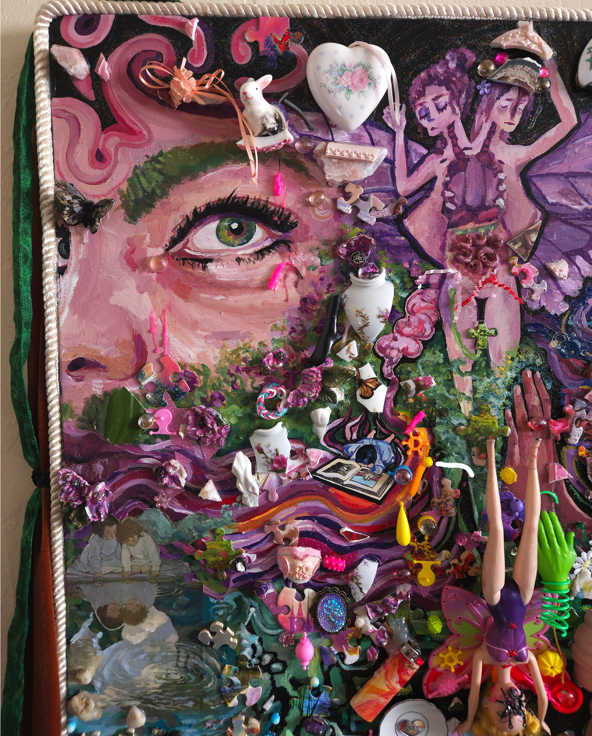 Girlhood Everlasting Found Objects (Macaroni noodles, Childhood Barbie, Storybook illustrations from A Childโs garden of Verses), acrylics on canvas 2024